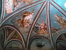 The Zodiac Room consists of fourteen lunettes representing twelve signs of the zodiac, since architect Portaluppi, in 1922, enlarged the room by knocking down the oblique windowed wall, gaining space to decorate it with two more lunettes, inside which inscriptions can be distinguished: the first is the motto 'Faire sans dire' and the other by the letters 'H and J' indicating the initials of Hector (Ettore Conti) and Joanna (Giannina Casati, his wife). The Zodiac Room is testimony to architect Portaluppi's skill in mixing what is authentic as it is truly ancient, and what is not. It can be seen that the wall to the west is heavily worked with frequent retouches, while the walls to the east, restored by the architect and Conti in 1922, are authentic.[6]