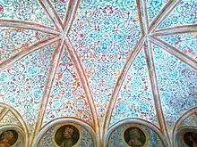 After many changes of ownership over the centuries, it came into the hands of the Conti family, who in 1922 had the house restored by the architect Piero Portaluppi, who heavily modified its appearance, but rediscovered part of the original frescoes.[4] The façade was completely redone and incorporated four medallions with sculpted portraits of the Sforza family by Pompeo Marchesi, while the fourteen lunettes frescoed with busts of the Sforza family are preserved from the original structure, believed to be the work of Leonardesque painter Bernardino Luini, now in the rooms of the Castello Sforzesco Museums, and some frescoes in the 15th-century courtyard, whose portico has umbrella ceilings with eight segments.[2]
