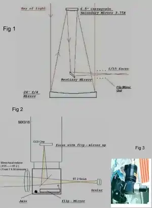 Figure 1 shows the light-path from a star based on the 0.61m telescope in Oslo. Figures 2 and 3 show the use of a focal reducer, flip mirror unit, ocular and CCD Camera. See also: Nasmyth telescope.