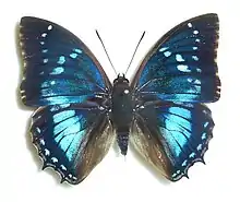 The wingspan is 65–80 mm for males and 70–95 mm for females.[3] Ch. xiphares Cr. male: the forewing marked almost exactly as in nandina, but the spots blue with the exception of the first two in the distal row; the basal part is tinged with blue, but usually not so distinctly as in the figure. The blue median band of the hindwing is placed further distad, is broader and distally deeply incised at the veins or even almost broken up into spots; small blue submarginal dots and blue or yellowish marginal spots. The female is very different from the male; the forewing is brown-black without blue markings, but with four white discal spots (in the middle of cellule 2, before the middle of 3 and at the base of 4 and 5) and 2 or more white spots behind the middle; small yellowish marginal spots in cellules lb and 2. The hindwing above in the middle between veins 2 and 7 with a very broad (about 15 mm.) ochre-yellow transverse band, distally irrorated with dark, which covers the basal half of cellules 2–6; streak-like blue submarginal spots and narrow yellowish marginal streaks. On the under surface the light spots of the forewing are larger and the hindwing has in the middle an irregular white band, proximally bordered with yellowish; the female is much larger than the Cape Colony, Kaffirland, Natal and Transvaal. Larva green with two whitish, red-centred and black-margined dorsal spots, the larger on segment 6 and the smaller on segment 8.[4]