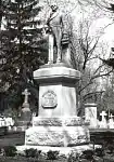 That same year, cemetery directors dedicated a life-sized sculpture of Evans. Crafted in bronze by A. S. Esterly and set atop a ten-foot-tall granite base, the six-foot-tall replica is located near the cemetery’s entrance and depicts Evans dressed in a waist coat, shirt with cravat, and trousers with his right hand holding a pair of gloves and his left holding a scroll.[36]