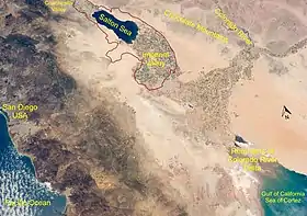 - ↑ Photograph by NASA from International Space Station, "Salton Sea and Southern California with Labels". Electronic Photograph, June 21, 2013. NASA, Salton Trough.