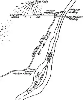 - ↑ Modified illustration by George Kennan, "Map showing location of various channels (headings) in 1904, based on illustration by George Kennan". Modified Illustration from The Salton Sea - An Accounting of Harriman's Fight with the Colorado River by George Kennan p.34, 2017. Google Books, The Three Headings (or Intakes), in Spring of 1905.