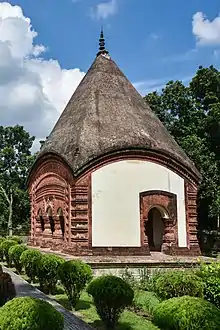 The temple stands next to the Bara Ahnik Mandir on a high platform, covered with a pyramid shaped vault. The temple's interior has one chamber with porches on the eastern and southern directions.[2] The southern frontage is extensively decorated with terracotta plaques, which depict ten incarnations Avatars of Vishnu, Lankakanda a chapter in the epic Ramayana legend, Radha-Krishna epic stories, flower designs and geometric art and scenes of the civic life of the period.[1] The frontage on the west has terracotta ornamentation panels some of which are in a dilapidated condition or pilfered.[2]