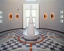 The patterns on Riley's African Textile Glass Panels, displayed at the Hartsfield-Jackson Atlanta International Airport, hark back to our ancestors in Africa, the mother continent for all humans. The layers are both horizontal and three-dimensional, the stacked design is achieved by carving into the front and back of the glass and applying a variety of tissue thin metal lead sheets to the back.[28][29]