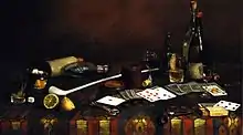 According to Christine Crafts Neal, Hirst's 1890s work, A Gentleman's Table "recalls the 17th-century Dutch tradition of the moralizing (vanitas) still-life composition."[8] The piece has the features of a typical bachelor still life, with pipes, bottles, glasses and cards arranged on a table. According to art historian Martha Evans, works in the oeuvre of contemporaries Peto and Harnett typically condoned the male culture that was represented and rarely offered depictions of alcohol. Evans relates that while Hirst's work was commissioned by a men's club in Chicago, she offers a subtle criticism of the male pursuits of gambling and drinking.[12] Most of the bottles are empty, implying that heavy drinking has taken place. The sugar cubes and sliced lemon suggest that one of the liquors is absinthe, "considered the 'cocaine' of the nineteenth century." The overturned bottles, the cards strewn about the table and the abandonment of a pyramidal composition create a sense of disarray in the work.[12]