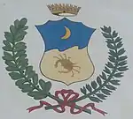Shield bearing two intertwined branches of oak and olive tree and crest, surmounted by a crown, depicting at the top a half waning moon and a crab at the bottom. |