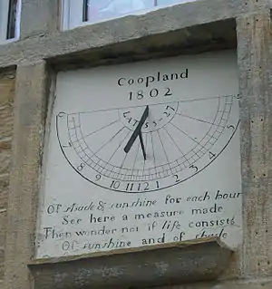 The house was constructed in 1802. It consists of two storeys with a three window range and is built from squared stone with a stone slate roof. The house had various additions and alterations to it in the 19th and 20th centuries. The front door has a square panel above with a vertical sundial attached, this has the date 1802 and the name Coopland on it.[1] It is not known if Coopland were the first family to live in the house or were the makers of the sundial. There is also a verse on the sundial which reads: