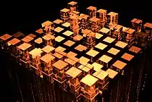 Chess Block | 2013 | An illuminated colour changing chess board primarily fabricated from optical glass | Glass, LED, electronics, stainless steel. |