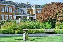 ... a country house in red brick and Portland stone. It has two storeys with attics, and is in Free Renaissance style. The main front is symmetrical, and has projecting wings linked by a balcony on paired Tuscan columns. In the centre of the first floor is an open pediment with paired Ionic columns and a Diocletian window. The other windows are casements, some with architraves, and some with pediments. The west front includes mullioned windows and a Venetian window.[5]