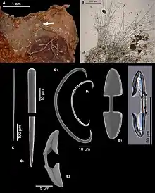 Esperiopsis cimensis sp. nov., Holotype ZMA Por. 07282. A. Habit encrusting a volcanic rock (indicated by arrow). B. Cross section of peripheral skeleton showing plumose spicule brushes. C-E. SEM and light microscopy images of spicules. D. Style. D1. Detail of apices. C. Sigmas. C1. Large sigma. C2. Small sigma. E. Palmate isochelae. E1. Left: large chela in dorsal view; right: large chela in side view. E2. Small chela. | |