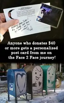 Within three weeks of the campaigning, the project was successfully funded to its target goal of $50,000. But the contributions kept going on until the last hour of the period given. During this time, different forms of planning on how the film will be shot were declared. Some included hosting a first-ever 24 hours live documentary show, traveling around the country in an RV with the Face 2 Face designs on it, beanie hats with tiny cameras fitted inside, and so on. These proposals were posted as video journals by Katherine Brooks. But these were abandoned due to the staggering expense.[5]