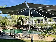 The Gagudju Association was initially established to distribute royalties from uranium mining in Kakadu amongst local Aboriginal people and provide self-determination on how best to use this money to benefit the community.[11] Under this model, the hotel's development was seen as a revenue-focussed investment, rather than a social enterprise and the association has little involvement in running it.[12] Although the venture has proven profitable, supporting an argument that it has provided economic benefits and employment without "selling-out" customs and traditions,[13] it is not without criticism. During 2000 the hotel hosted a hospitality traineeship program for 22 indigenous participants.[14] Despite this, during the same year only 6 aboriginal people were employed by the Gagudju Association's tourism ventures.[15]