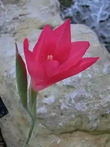 Gladiolus carmineus is a perennial plant belonging to the genus Gladiolus and is part of the fynbos. The plant is native to the Western Cape and occurs from Cape Hangklip to Cape Infanta. The plant has an occurrence area of less than 20 km2 and is threatened by development on the coast.