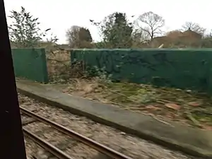 ![]() A view of the disused station platform, taken from a passing train in 2015. | |