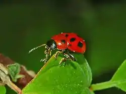 These beetles are 6–7 mm long, the head is black, elytra and pronotum are red, with two black dots on the pronotum and five black dots on the elytra. The larvae are yellow-gray, with black spots on the back and sides and three pairs of thoracic legs.[4]