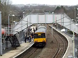 Following a major recast of the Argyle Line timetable in the wake of the electrification of the Whifflet Line, the service pattern from this station has altered significantly. There are still two trains per hour each to Motherwell and Larkhall, but one of the former now runs to Cumbernauld via Whifflet rather than Lanark. Glasgow-bound services meanwhile now call at all stations to Central Low Level and then proceed to Dalmuir via Clydebank or to Milngavie.[2] On Sundays, there is a train every half-hour each way to Motherwell and Milngavie and an hourly service each way on the Larkhall to Balloch route.