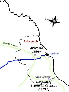 The history of the Hospital of St John the Baptist, "iuxta Aberbrothoc" [near Arbroath],[2] is not certain. Miller (1860) in his History of the Abbey at Arbroath provides a workable framework. He writes: