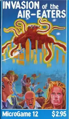 Invasion of the Air-eaters is a two-player microgame in which one player represents a race of alien creatures that starts an invasion of Earth with the intention of converting the atmosphere to sulfur dioxide to make it breathable for them. The other player takes the side of the Terrans, who try to stop the invasion and save Earth.[1] The aliens begin the game with technical superiority, but the Terrans can try to overcome this by diverting industrial resources into research and development of new weapons.