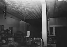 The interior of the building consists of two floors. The first floor has a hardwood floor, finished plaster walls, and a pressed metal ceiling. The floor is divided by a square concrete posts with a central beam, creating two bays. The second floor has two large rooms in the front of the building, with an additional ten smaller rooms, five on either side of a central corridor. The second floor also has hardwood floors and plaster walls. There is also an attic and basement.[5]