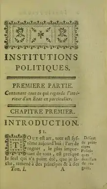 His most relevant work “Institutions Politiques” is written in the tradition of Fürstenspiegel (Kings Mirror), which goes back to Greek (Aristotle) and Roman (Pliny the Younger) and aims to list the virtues and duties of rulers and princess to establish the necessary wisdom and principles for good governance.[12] The work was well recognized among kings and queens like Katharina the Great, who gave order to translate it into Russian.