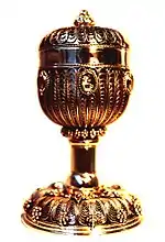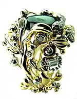 In London, Angelett continued to work on and expand the Royal Garden collection inspired by the Australian nature. An example from the collection is the ring Veronica Perfoliata created with the use of CAD and laser technology.[20] In parallel with modern techniques Angelett is continuing to use the ancient technique of cloisonné, which was used in the Cup of David in Australia. The Holy Kingdom Ring, designed by Angelett in London for the former Governor-General of Australia Dr Hollingworth, is implemented in this technique. The Holy Kingdom Ring is "Manifestation of biblical passage which painted a picture of Holy Kingdom with the image of Jesus Christ depicted in ancient technique of polychrome cloisonné enamel".[13] For creation of this ring Angelett conducted research on "remarkable collection of papal rings, dating back to fourteenth century"[13] in the British Museum in London.