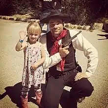 Born in Lake Forest near Chicago, Dillon's family moved to Lake Don Pedro, California where he states he had the Western influence around him with learning how to ride horses and shoot guns with his father.[2] Performing tricks first came with cap guns. "When I was young, I had a wooden and metal pirate pistol from Disneyland," he said. "It was so easy to spin back and forth, I'd go to sleep at night twirling it around my hand. We're all blessed with certain talents -- I'm not good at everything, but this (gun-spinning) is something I can do well."[3] Once he mastered these he moved on to unloaded real guns. After high school, he moved to Chicago in hopes of becoming a comedian and actor. He took classes with The Second City with a mind to someday be part of Saturday Night Live. While there he honed his comedic talents as a standup at open mic nights. In his early twenties Dillon relocated to Union, Illinois he happened to move next door to Donley's Wild West Town and presented to the management his unique ability as a gunslinger. He quickly landed a position as a part time entertainer, to which Dillon recalled: "I'd have a little portable stereo on a picnic table, I'd hit play on a Western-sounding song, and I'd sit there and spin guns."[4]