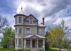 It is a three-story house with a pedimented porch. It has an octagonal corner tower and a hipped roof with abbreviated gables.[2]