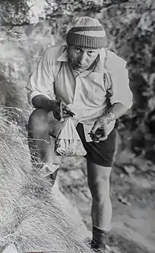 While searching for liverworts in 1975, Bartlett came across an unusual species of rātā growing at Radar Bush, 9.5 km south-east of Cape Reinga. His attention was drawn to the tree’s distinctive bark, which is spongy, whitish and flakes easily, but he was unable to reach any branches. He took bark fragments to Victoria University botanist John Dawson, who was unconvinced that the tree was unusual. Bartlett returned to the area with a rifle, with which he was able to shoot off a branch. It was ten years before its white flowers were seen by scientists in 1984, appearing ‘like snow over the tree crowns’ and allowing the new species to be formally described and named Metrosideros bartlettii, known as Bartlett's rātā, or rātā moehau in Māori.[5][6][7] Bartlett's rātā is now grown as a garden plant, but only 13 adult Bartlett's rātā are known to still exist in the wild.[8]