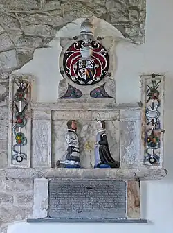 He died on 5 March 1584. He was buried in St Budock's Church, near Arwenack, where there is a mural monument to him, erected by his grandson in 1617, showing effigies of him and his wife facing each other kneeling in prayer.[2] He died heavily in debt: his brother, the leading diplomat Sir Henry Killigrew, paid off some of his more pressing debts, but his son John entered on an inheritance which was already insolvent, and died a ruined man in 1605.[3][4]