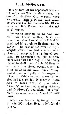 When boxing commitments allowed, McGowan played Australian rules football with VFA club South Melbourne (Now known as the Sydney Swans) during the club's successful late 1880s to mid 1890s period, including at least one Premiership team in 1890.[5]