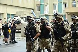![]() Colonel Grzegorz Kaliciak, director Krzysztof Łukaszewicz and actors on the Karbala movie set | |