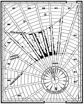 The curved lines on the plaza mark the location of the Summer and Winter Solstice and show the path of the shortest and longest shadows of the year. The straight east–west line locates the path of the Spring and Fall Equinox. The times inscribed on the stone outer circle represent natural or "Sun" time. The walkways are located at the mean position of Eastern Standard Time. The inner circle is marked with words from Ecclesiastes which reflect upon the nature of time and the seasons.[4]