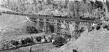 In 1895 a wrought iron replacement of the viaduct was put out to tender.[48] It was won by J & A Anderson & Co of Christchurch in 1896 for £4,728,[49] though in 1899 the cost was put at £6,684, presumably including the approach banks.[38] In the same era Andersons also rebuilt Makotuku (1898), Matamau (1899), Mangatera (1900), Ormondville (1904) and Makatote (1908) viaducts.[50] Floods and earthquakes created problems with the approach banks, closing the line for about 4 days in 1896.[51][52] An earthquake was noted as early as 1878.[53] The approach to the viaduct slumped about a foot in the 1904 earthquake[54] and the viaduct was damaged in the 1931 quakes[55][56] On 12 September one of the piers subsided[57] and on 18 September 1932 some 200 ft (61 m) of the northern approach sank about 20 ft (6.1 m), was closed for repairs for 5 days[58] and then a washout occurred about a month later,[59] after a new approach had been built.[60] The bank approaching the viaduct also subsided slightly in a 1934 quake.[61] During another earthquake in 1938, a train was crossing, but the viaduct was undamaged.[62] Pier 5 was underpinned in 1983.[63]