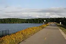The lake has long had a nature trail around the lake, including passing through the Botanical Garden of the Ozarks. The Lake Fayetteville Nature Trail is a dirt path with tree markers passing through the oak-hickory forest typical of the Ozark Mountains. The first segment of paved trail connecting to the Razorback Regional Greenway was completed in 2007,[4] with a full 4.5 miles (7.2 km) paved trail around the lake completed in 2013.[5] The nature trail was rehabilitated and expanded into a mountain biking trail beginning in 2010.