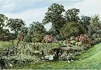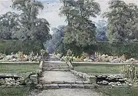 Her initial London showing in 1898 at the Royal Society of British Artists was atypical of her subsequent work being a watercolour study of a Small tortoiseshell and Cornflowers. She completed a series of detailed studies of butterflies at this time including Butterfly On Blackberry Bush shown at the Bedford Society of Artists which the Bedfordshire Times described thus ... of such minute fidelity as to bear scrutiny with a magnifier. This lady's exact drawing and colouring should be of great value to publishers and men of Science, but there is also poetry in the motion and the composition ....[13] This was a perspicacious review as Stannard's colourful reproductions began to appear on postcards and to be included in popular gardening books such as those by Walter and Horace Wright.[4] Lucrative commissions from owners of some of the finest gardens in England also materialised.[1] In June 1906 a solo exhibition of fifty-two watercolours at the Mendoza Gallery entitled Summer Gardens of England[14] was patronised by the Princess of Wales who bought, The Lover's Walk, Wavendon House.[2] Many of England's grandest gardens and houses were represented: Woburn Abbey, Penshurst Place, Hampton Court, Levens Hall are all featured. The Observer newspaper review was fulsome in its praise ...I defy any lover of an old-fashioned English garden to see these drawings without real delight. There is a peace, a repose, almost a fragrance about each and all of them ...[15] The Times critic was less effusive but described Stannard as ... a serious rival of other artists who have devoted themselves to gardens ...[16] A major commission came from Lady Anastasia Wernher (1892-1977), for whom she painted a series of views of the gardens at Luton Hoo in Bedfordshire.[12] A further exhibition of thirty watercolours entitled Flower Gardens of England at the Mendoza Gallery in 1907 was similarly well received.[17]