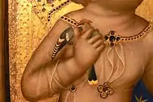 In its composition, the picture has much in common with the Madonna of Veveří type and the later Madonna of Rome. At the same time, however, it also repeats several motifs from earlier Marian pictures. Its colour palette recalls the painting of Tomasso da Modena. The motif of the Infant Jesus holding a goldfinch or waxwing (here) was widespread through Italy from the early 14th century and appears in the Rajhrad Breviary of Queen Elizabeth Richeza of Poland.[6] In contrast to the older Italian-Byzantine type of Madonna, the Hodegetria in which the mother presents the child as an object of worship, in this composition there is a tangible shift to a more human and intimate relationship between the mother and child that corresponds more to the ideas of believers around the mid-14th century.