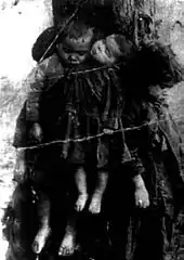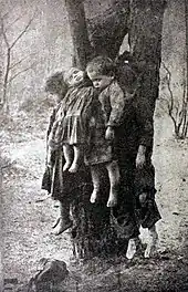 Unable to receive help from the local Romani and Polish communities, the 32-year-old woman wandered with her children in the freezing swamps between the villages of Antoniówka, Dąbrowa Kozłowska and Siczki.[2] Dolińska, who was mentally ill, decided that the only way to protect her children from starvation was to end their lives. On 11 December 1923 at around 8 p.m. she killed Zofia (6 months), Antoni (3 years), Bronisława (5 years) and Stefan (7 years) and tied them to a tree.[2] The next day she went to the police station in Radom and confessed to the crime. Dolińska was placed under arrest following an on-site investigation. A police photographer took several photographs of the hanged children.[2]