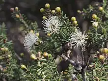 The flowers are white or cream, a single flower (or rarely a pair) on the ends of branches which continue to grow after flowering and are about 10 mm (0.4 in) in diameter. The petals are 3.5 mm (0.1 in) long and fall off as the flowers mature. The stamens are arranged in five bundles around the flower, each bundle with 11 to 26 stamens. Flowers appear in spring and the fruit that follow are woody capsules 3.8–5.5 mm (0.1–0.2 in) long.[2][3][4]