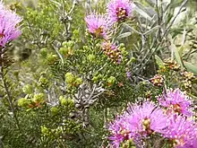 The flowers are a shade of pink to purple and are arranged in heads on the ends of branches which continue to grow after flowering. The heads contain 2 to 6 groups of flowers in threes and are up to 16 mm (0.6 in) in diameter. The stamens are arranged in five bundles around the flowers and each bundle contains 3 to 7 (but mostly 3) stamens. Flowering occurs between August and January and is followed by fruit which are woody capsules 2.5–4 mm (0.1–0.2 in) long in loose clusters.[2][3]