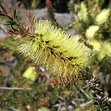 Melaleuca virens, commonly known as lime bottlebrush, is a plant in the myrtle family, Myrtaceae and is endemic to Tasmania in Australia. (Some Australian state herbaria continue to use the name Callistemon viridiflorus.)[2] It is one of only two melaleucas endemic to Tasmania, the other being Melaleuca pustulata although another six also occur there. A small to medium shrub growing mostly in subalpine areas, it has hard, leathery, sharply pointed leaves and spikes of yellow or greenish flowers in early summer,