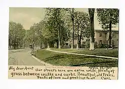 From a 1907 postcard: "Our streets here are extra wide, plenty of grass between walks and curbs. Beautiful old trees. Packs of love and greetings to all, Carl"