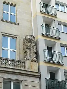 • Stone knights' armorials and lions decorating the Ministry of Army Affairs (Defence) near Nowowiejska St., two lions guarding entrance, after WWII placed in front of the Lubomirski Palace.[14]