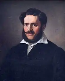 Baron Miklós Wesselényi de Hadad (Hungarian pronunciation: [ˈmikloːʃ ˈvɛʃɛleːɲi]; archaically English: Nicholas Wesselényi;[1] 20 December 1796 – 21 April 1850) was a Hungarian statesman, leader of the upper house of the Diet, member of the Board of Academy of Sciences, hero of the 1838 Pest flood. A prominent and wealthy Hungarian aristocrat, son of Baron Miklós Wesselényi and Ilona Cserei, he was born at Zsibó (now Jibou), and was educated at his father's castle by Mózes Pataky in a liberal and patriotic direction.[2] He inherited his father's physical strength, and he further trained himself in different sports, such as horse-riding and swimming. He was a celebrity in his age for his sportsman's accomplishments.