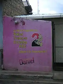 After the 1990 Sandinista loss in the Nicaraguan elections, the mayor of Managua, Arnoldo Alemán, started a campaign to paint over and destroy the murals, even though these murals were protected by various articles of the Nicaraguan constitution and Law 90.[4] These statutes called for the protection of Nicaraguan culture, as well as for freedom of expression and preservation of "historic patrimony." None of those responsible for the destruction were ever successfully prosecuted.[5] Alemán continually denied his sponsorship of the destructions and elimination of the murals and promised repeatedly to compensate the different artists for their lost artwork, although few payments were in fact made. It is suspected that much of the destruction movement was sponsored by the U.S. government in their attempt to eliminate pro-Sandinista, anti-U.S. imperialism propaganda from Nicaraguan society. Many of the oldest, best and most centrally placed murals were painted over and now only exist in memory, or in some cases in photographic records. After Alemán's campaign was underway, however, a movement of artists and concerned groups began to raise funds to restore and protect these murals and were successful to some extent; new murals were painted as well under the eventual return of Daniel Ortega and the Sandinista National Liberation Front leadership in 2008.[1]
