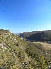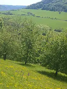 NSG Leutratal und Cospoth (often referred to simply as Leutratal) is an important nature reserve in Germany, southwest of the town of Jena. The reserve is maintained by Naturschutzbund Deutschland. The reserve contains the valley of the river Leutra and beech forest. The nature reserve measures 582.9 hectares. The bedrock is Muschelkalk (limestone).[1] In 2018, 23% of the reserve was pine forest and 16% broadleaf trees, 23% was xerothermic meadow, 9% brome semi-dry grassland and 14% agricultural use.[2] Rare tree species growing in the forests and on the slope include wild pear and wild service tree.