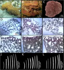 The sponge mass is lobated, with regular to irregularly shaped lobes typically 3 to 5 cm (1.2 to 2.0 in) tall. Each lobe has one opening (oscule) about 2 to 5 mm (0.079 to 0.197 in) in diameter, either located flush on the surface or elevated in small chimneys. The spicules are composed solely of strongyles, cylindrical in shape with rounded ends.[4][5]
