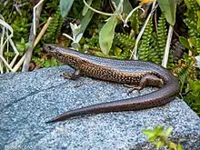 Oligosoma awakopaka, the Awakopaka skink, is a rare species of skink (alpine lizard) found in New Zealand.[2] It can reach a snout-vent-length (SVL) of up to 77 mm and has a glossy, vibrant brown-yellow dorsal surface flecked with black, and typically sports a faint pale dorsolateral stripe edged with black. The ventral surface is vivid yellow and flecked with black as well (van Winkel et al., 2018; Jewell, 2008).