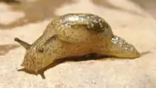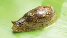 Omalonyx convexus can be up to 4 cm in total length.[1] Tegument and mantle coloring varies between milky-white, orange and beige.[1] The tegument and mantle have irregularly sized and distributed blackish spots, which, depending on their quantity, can sometimes give the animal a dark gray appearance.[1] Beige was the most commonly observed coloring (Arruda & Thomé).[1] Because of their translucence, milky-white individuals sometimes display the same coloring as the substrate.[1] Because of its wide variability in color, Omalonyx convexus can be confused with other Omalonyx species: Omalonyx matheroni, Omalonyx pattersonae and Omalonyx unguis.