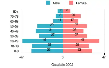 According to the 2002 Poland census, there were 454 people residing in Ossala village, of whom 50.4% were male and 49.6% were female. In the village, the population was spread out, with 25.6% under the age of 18, 40.5% from 18 to 44, 19.2% from 45 to 64, and 14.7% who were 65 years of age or older.[2]